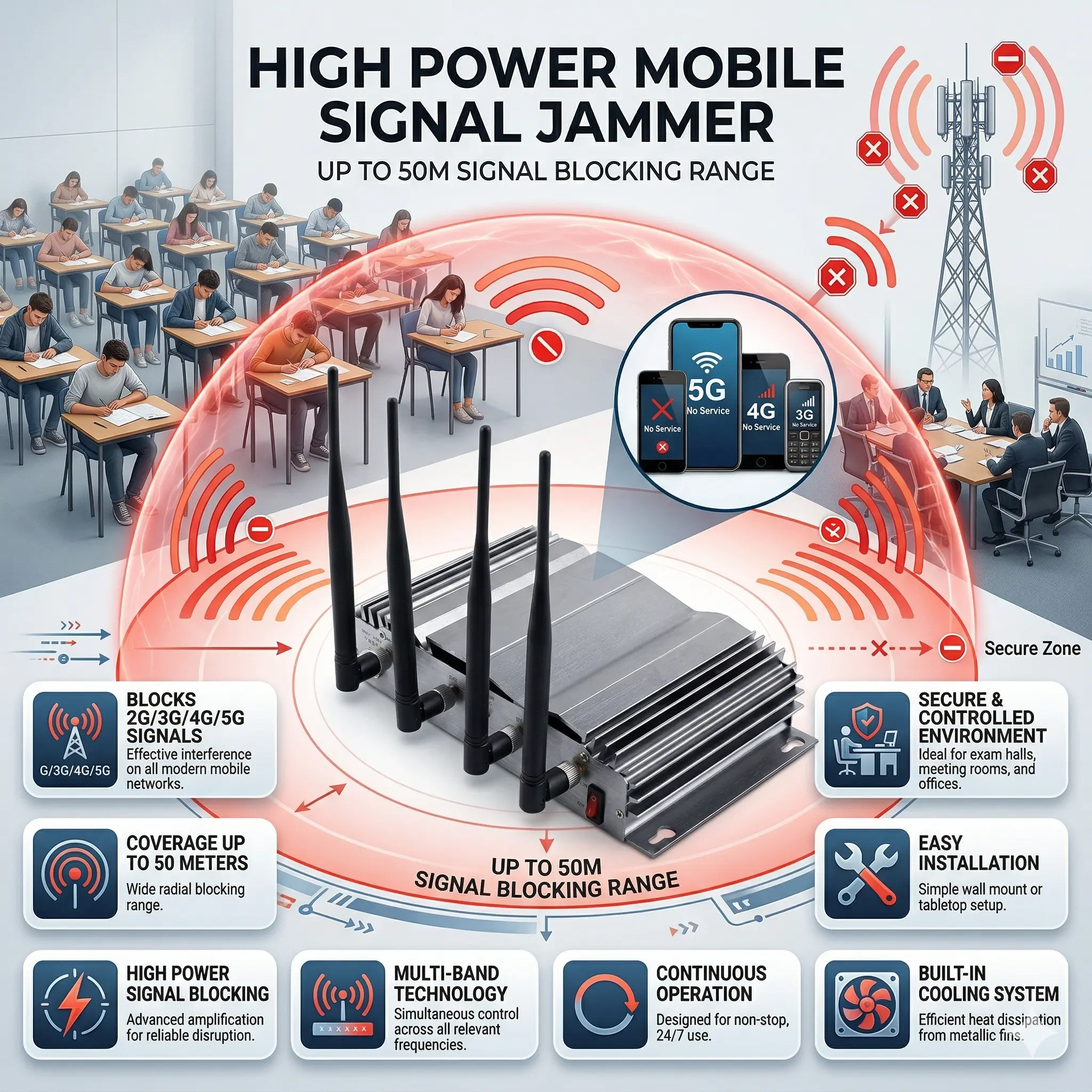 Ensure controlled and distraction-free environments with this high-performance 50 Meter Range Mobile Signal Jammer, designed to block 2G, 3G, 4G, and 5G network signals effectively. Ideal for offices, exam halls, meeting rooms, and security-sensitive areas, this device prevents unauthorized mobile usage, ensuring privacy, focus, and compliance in critical spaces.