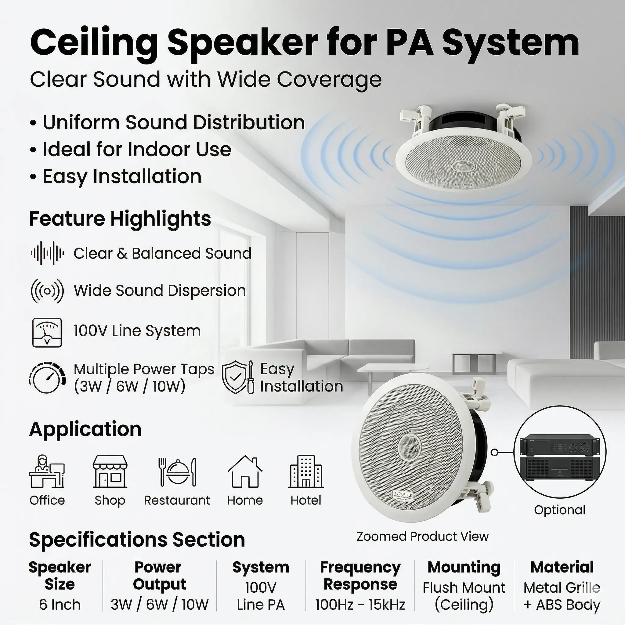 The 6 Inch Ceiling Speaker is a high-performance PA speaker designed for clear sound distribution in indoor environments such as offices, shops, malls, schools, and homes. Built for 100V line public address systems, this flush mount ceiling speaker ensures uniform audio coverage with crisp voice clarity and balanced music output. Its compact and sleek design blends seamlessly with ceilings, making it ideal for background music and announcement systems.