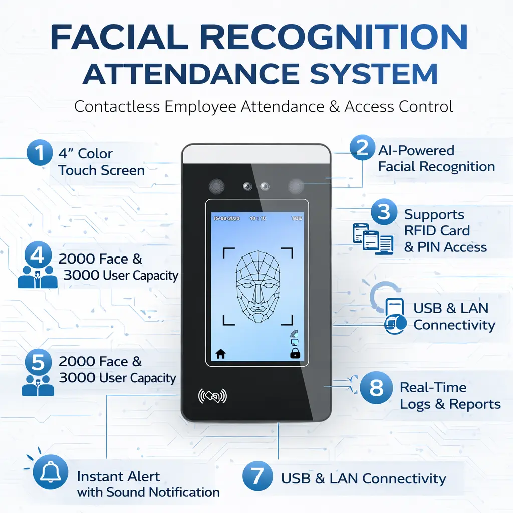 Upgrade your workplace security with this advanced AI Face Recognition Attendance Machine, designed for fast, contactless, and highly accurate employee attendance tracking. Built with dual camera technology and intelligent facial recognition, this device ensures reliable performance even in varying lighting conditions.