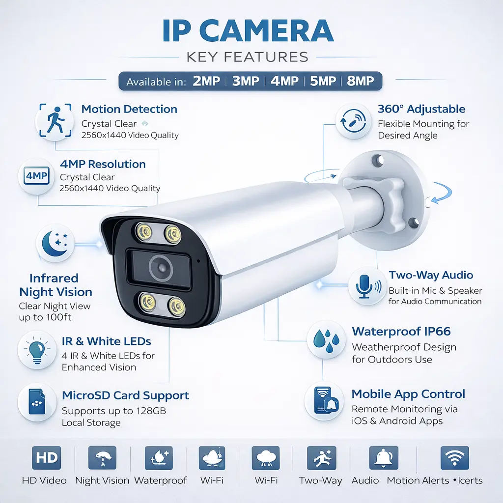 - πΈ Multiple Resolution Options β Available in 2MP / 3MP / 4MP / 5MP / 8MP for crystal-clear video quality