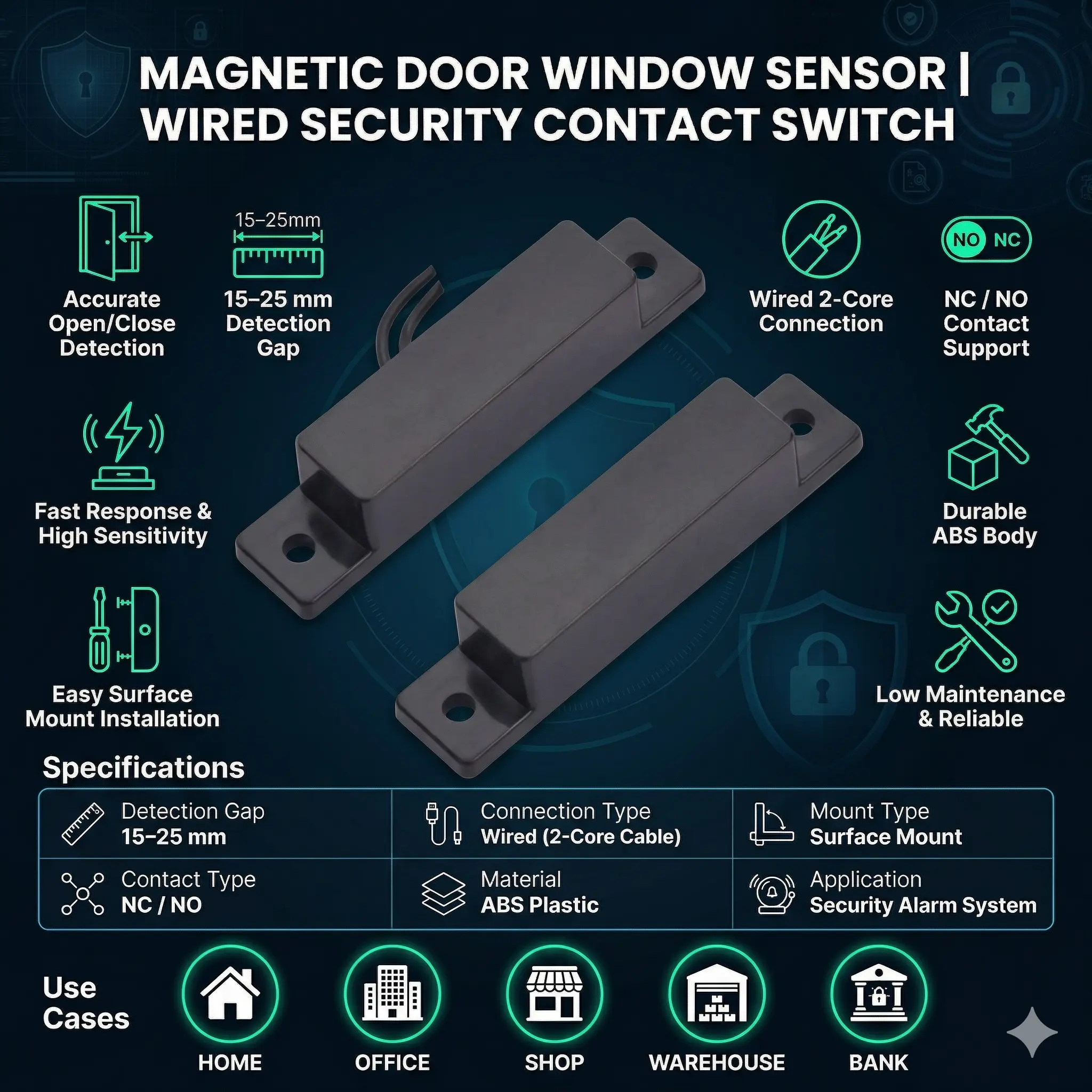 The Magnetic Door Window Sensor Switch is a reliable and essential security device designed for home and commercial alarm systems. Also known as a magnetic contact sensor or reed switch, this wired door sensor detects the opening and closing of doors and windows, instantly triggering the connected alarm system. Built with a high-quality ABS body and precision reed switch mechanism, it ensures accurate detection and long-lasting performance. Supporting both NC (Normally Closed) and NO (Normally Open) configurations, this surface mount magnetic sensor is easy to install and compatible with most security alarm systems. Ideal for homes, offices, shops, warehouses, and industrial spaces, it enhances safety by providing real-time intrusion detection and anti-theft protection. With low power consumption and stable performance, this door and window sensor is a must-have component for modern security systems.