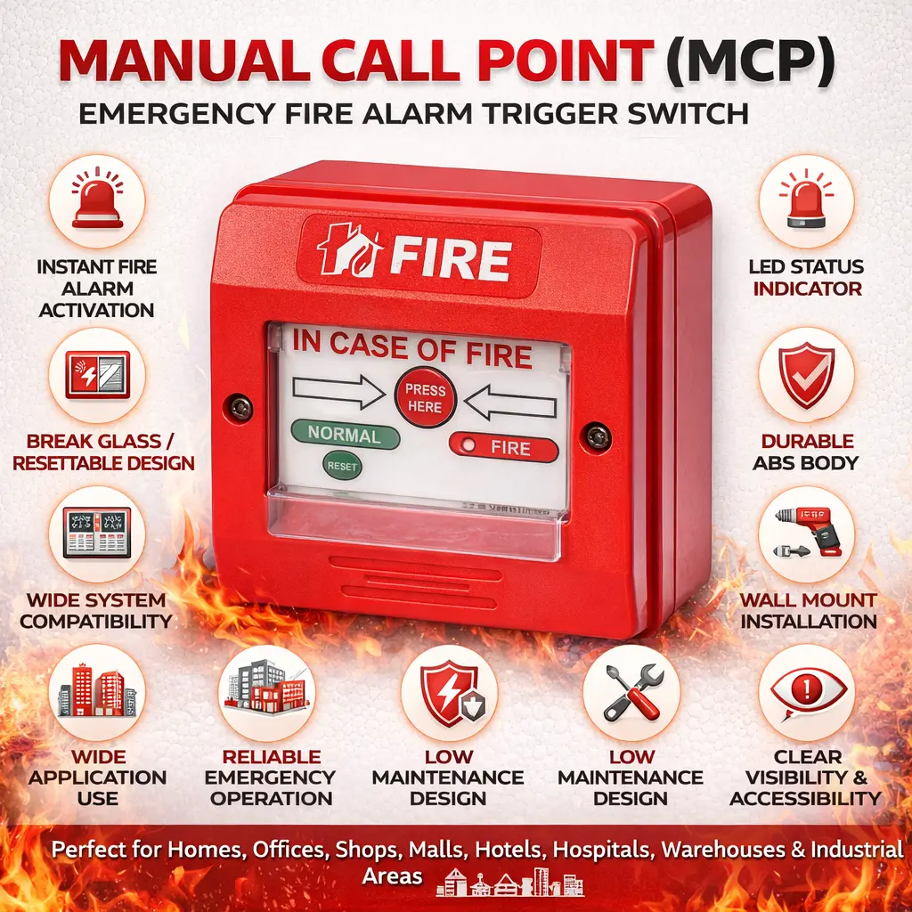 The Manual Call Point (MCP) is an essential fire safety device designed for quick and reliable emergency alarm activation. This fire alarm call point, also known as a break glass switch or manual fire alarm switch, allows users to instantly trigger the fire alarm system during emergencies. Built with a durable ABS body and equipped with a bright LED indicator, this wall mount call point ensures clear visibility and long-lasting performance. Ideal for use in homes, offices, commercial buildings, factories, warehouses, hotels, and industrial areas, it plays a critical role in fire protection systems. Compatible with most conventional fire alarm systems, this resettable manual call point provides fast response, easy installation, and dependable operation, making it a must-have fire alarm accessory for complete safety and security.