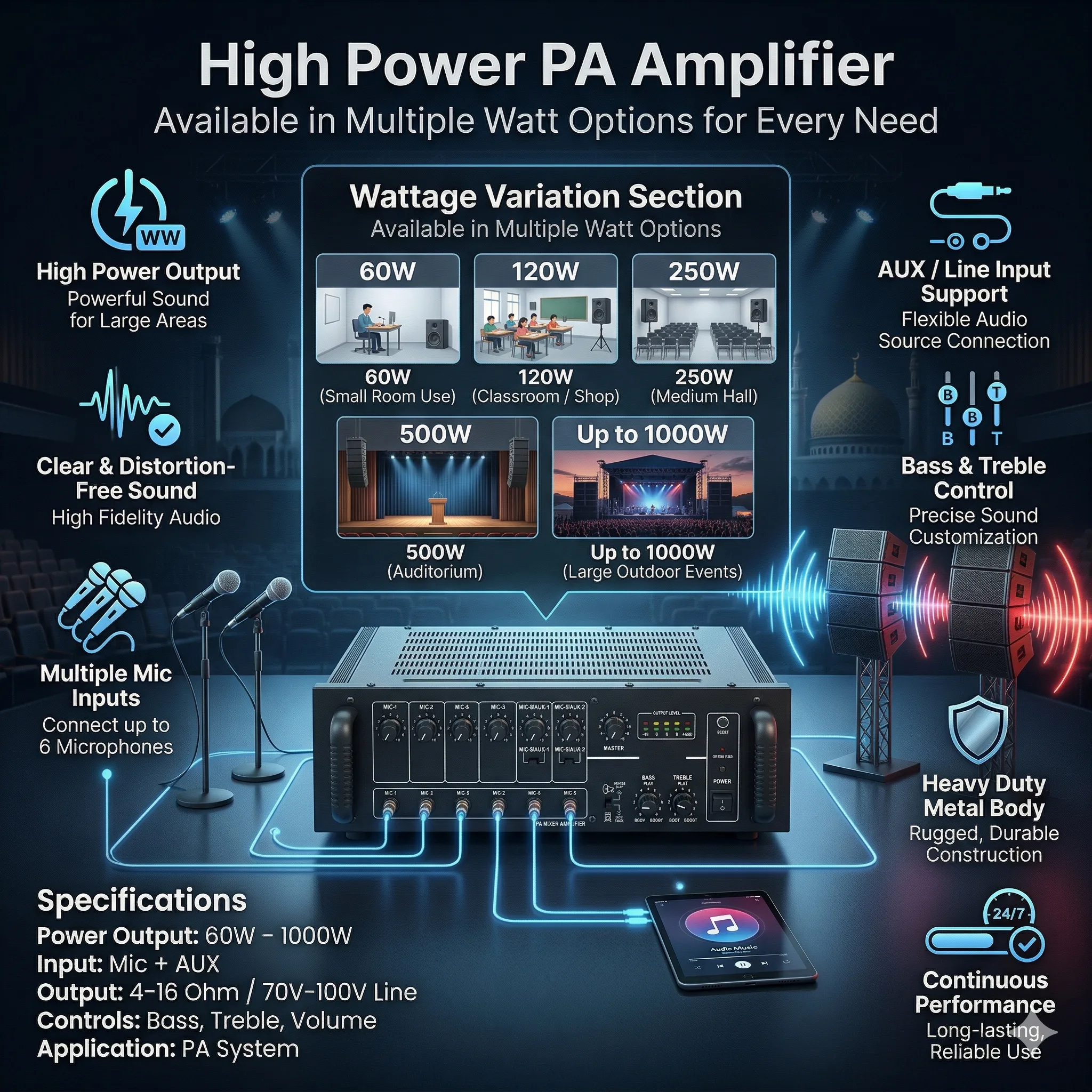 Built with advanced circuitry, the amplifier features multiple mic inputs, AUX connectivity, and tone control options, allowing seamless integration with microphones, music players, and other audio devices. The rugged metal body ensures durability for continuous use, while the efficient cooling system supports long hours of operation without overheating.